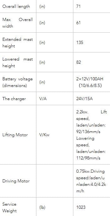 Stacker includes 24 DC Drive Motor and 24V Lift Motor. Comes with Polyurethane Wheels and Ergonomic Handle and Controls. Product is made with steel construction.