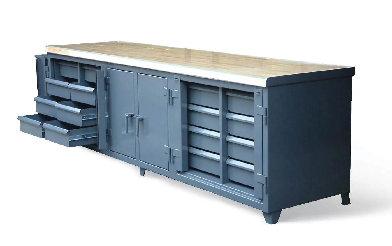 A Plus Warehouse offers made industrial grade work benches. You will not be disappointed with our large selection! The supreme workbench contains two lockable compartments for larger storage. This unit includes 16 drawers and each drawer can be locked. It also is an attractive product with a nice maple top to put it all together. Th 12 GA construction will last a lifetime! Three inch tall legs allow for sweep space and forklift accessibility. There are four sections, each containing four, six inch deep drawers. Each drawer can hold up to 400 pounds. The lock bar keeps items safely hidden. This bench is great for tasks of all kinds including packaging, wood working, and mailing. The standard color for this workbench is grey but is also available in medium grey, steel stone, dark blue, safety yellow, signal red, Buff, Midnight Black, and White. A Plus Warehouse is your right source right now! Whenever ordering products at A Plus Warehouse, customers are guaranteed superior customer service. We do everything we can to assure customers have a positive experience.