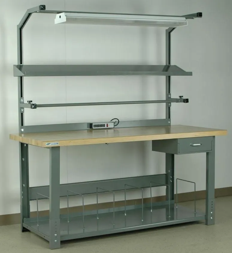 This workbench includes 60" L X 30" D X 30"-36" H base bench, power supply, a 6" drawer, 12" Deep shelf, light fixture, and bin holders. The two tone color scheme adds a nice touch to this product.